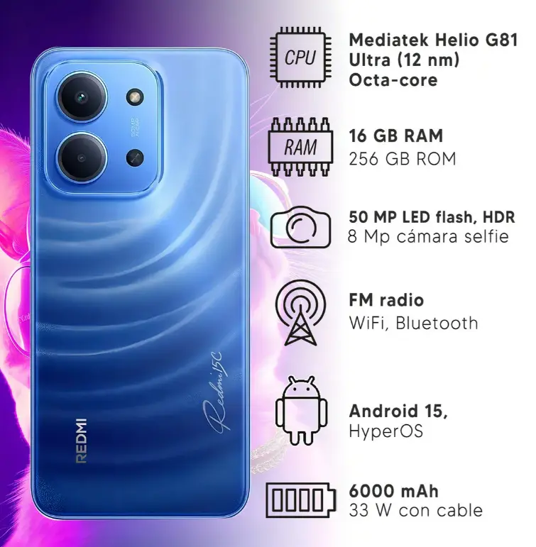 Xiaomi Redmi 15C 16/256 Gb El Xiaomi Redmi 15C es un smartphone de gran precio y prestaciones, con una gran batería de 6.000 mAh y carga rápida de 33W, pantalla IPS LCD de 6,9 pulgadas a 120 Hz y resolución HD+, procesador MediaTek Helio G81, cámara principal de 50 MP, y sistema operativo Android 15 con HyperOS. - Equipo libre para todas las compañías - Pantalla 6.9" LCD IPS, 120 Hz resolución 720 x 1600 píxeles relación de aspecto 20:9 (densidad de ~254 ppp) - Sistema Operativo Android 15, HyperOS 2 - Procesador Mediatek Helio G81 Ultra (12 nm) Octa-core (2x2,0 GHz Cortex-A75 y 6x1,8 GHz Cortex-A55) Mali-G52 MC2 - Ranura de Tarjeta: microSDXC (ranura dedicada) - Memoria RAM: 16GB (8 Físicas + 8 de Asistencia Virtual) - Almacenamiento interno: 256 Gb - Cámara principal: Flash LED, HDR. 50 MP, f/1.8, 28 mm (gran angular), 1/2.76", 0.64 µm, PDAF QVGA, f/3.0. Video 1080p a 30 fps - Cámara Selfie HDR 8 MP, f/2.0, (gran angular), 1/4.0", 1,12 µm. Video 1080p a 30 fps - Conector de 3,5 mm: sí - Altoparlante: sí - Wi-Fi 802.11 a/b/g/n/ac, doble banda - Bluetooth 5.4, ??A2DP, LE - GPS, GLONASS, GALILEO, BDS - NFC: no - Radio FM - USB Tipo-C 2.0, OTG - Huella dactilar (lateral), acelerómetro, brújula, Detección de proximidad virtual - Batería 6000 mAh 33 W con cable, PD - Medidas: 17.16 x 7.95 x 0.8 cm | Peso 205 g